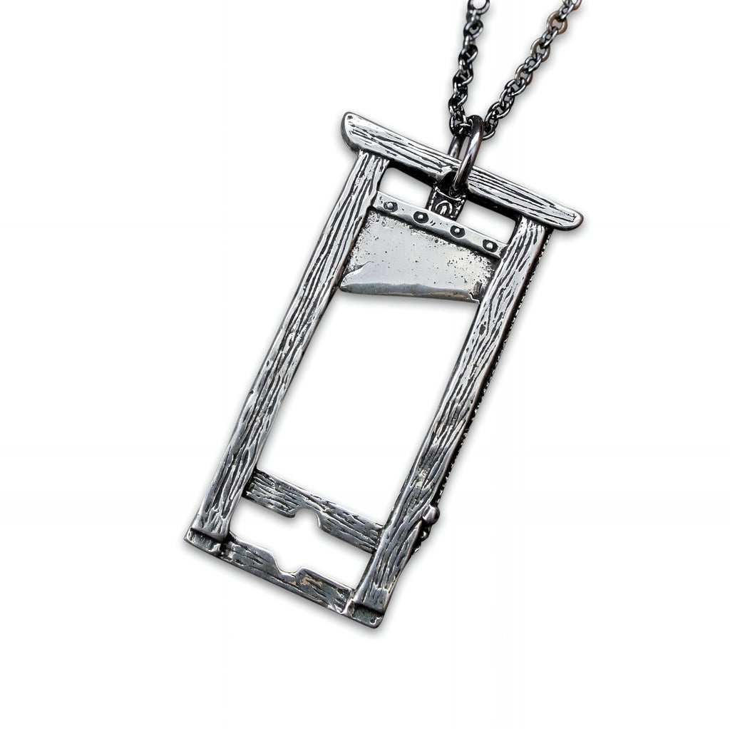This completely 3D guillotine pendant is handcrafted and enhances all the little details like the pronounced grain in the wooden frame and stocks, the twisted braid in the release rope latched on the side and even the tiny rivet heads that secure that wicked looking blade into the supporting cross-beam. If you want, you could spice it up even more by adding a touch of blood red nail polish to the edge of the blade.